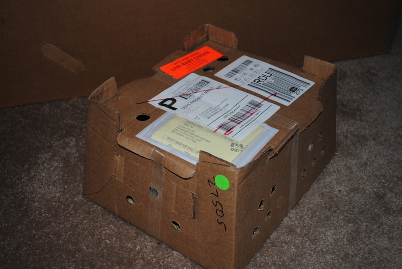 This is a pic of the box the baby chicks come in. There are 26 little chicks crammed in there, it's a tiny box, b/c they need each other's body warmth to make the trip!